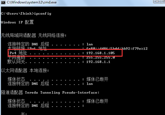 检查PC1、PC2的IP地址分配:分别在PC1、PC2“运行”中输入cmd,进入命令提示符,然后输入ipconfig并回车: