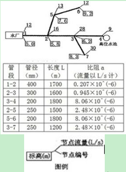 分析:如上图所示,高程最高的用水点是节点6(标高为9.2m),距离水厂最远的用水点是节点7(距离水厂950m),流量最大的用水点是节点7(流量为30L/S)。初步判断节点6或者节点7有可能为控制点,下面进行具体计算。